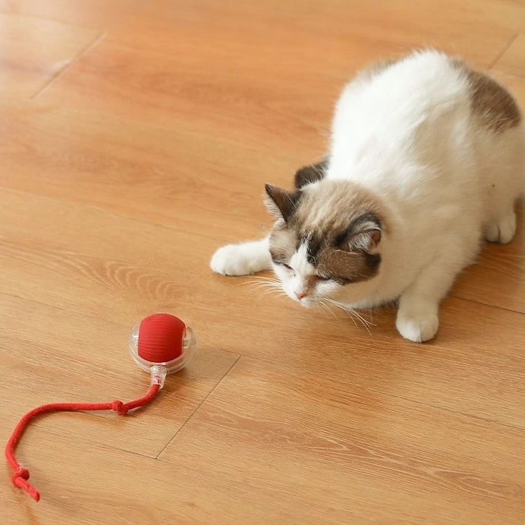 De Swoopie MotionBall beweegt onvoorspelbaar in alle richtingen en heeft een vastgebonden touw (zou het een staart zijn..?) waardoor het natuurlijke jachtinstinct van katten wordt geactiveerd.